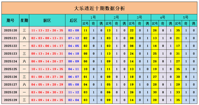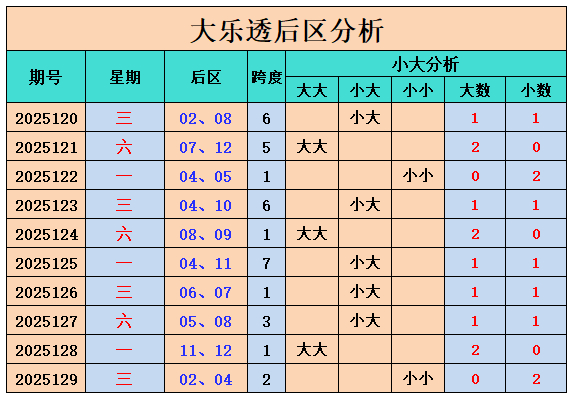 最近10期后区大小比为11:9,最近10期后区大大组合开出3期,小大组合开出5期,小小组合开出2期。上期开出小小组合,本期看好小大组合出现。