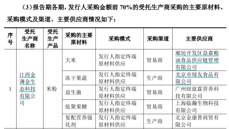 另据英氏控股官网在2025年9月10日发布的《英氏控股致高大耗尽者的一封信:对于居品性量的精通应承与说明》中提到:“英氏婴幼儿米粉居品现在由全资子公司湖南英氏养分食物有限公司自主分娩”。但据公司本次苦求上市发布的《审核问询函的恢复》,第356页表示的“请问期各期,刊行东谈主采购金额前70%的受托分娩商采购的主要原材料、采购形态及渠谈、主要供应商情况”,其中波及到向受托分娩商“江西金薄金生态科技有限公司”录用分娩米粉居品的记录。针对英氏婴幼儿米粉居品是否有子公司自主分娩这一细节信息,此段信息表示,与该公司此前发布的《应承与说明》存在矛盾。